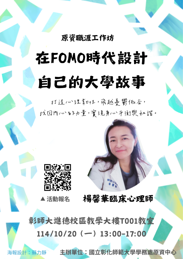 在FOMO時代設計自己的大學故事。Designing Your Own College Story in the FOMO Era. 彰化師範大學 13:00-17:00 20.10.2025 我也要邀請講師 Share