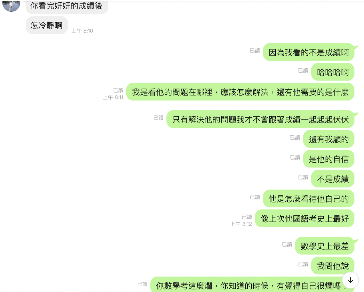 但我也遇過讓我印象深刻的個案,這個女生在進國一的時候,就是老師與同學的「麻煩」,因為成績不優、作業遲交被貼上標籤,她沒有領特教身份,但我在接觸他的過程當中,可以知道她應該是智商較弱的族群,耳聞導師每天打電話「叮嚀」他的父母要跟緊學校的進度,後來?後來這位個案轉學了,轉學到台中另一間開放的私校,有好了嗎?當然沒有。後來她爸媽應該是再也受不了這種一天到晚講成績要作業的台灣教育體制,直接把她送到美國,我最後知道她的時候已是20歲的成年人,找到自己的熱忱,對花藝很有興趣,也很投入其中。但是我也想要問,我們有多少家長有這樣的經濟與破釜沈舟?我們的教育養出多少人是:「興趣是什麼?可以吃嗎?快樂是啥?不就是賺錢生活!」?現在在看我文章的你呢?你是哪一種呢?你是選擇看成績,還是帶孩子看見自己?讓我再換個方式來問:「你在意的是學校的成績單?還是人生的成績單呢?」